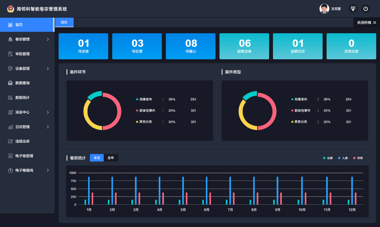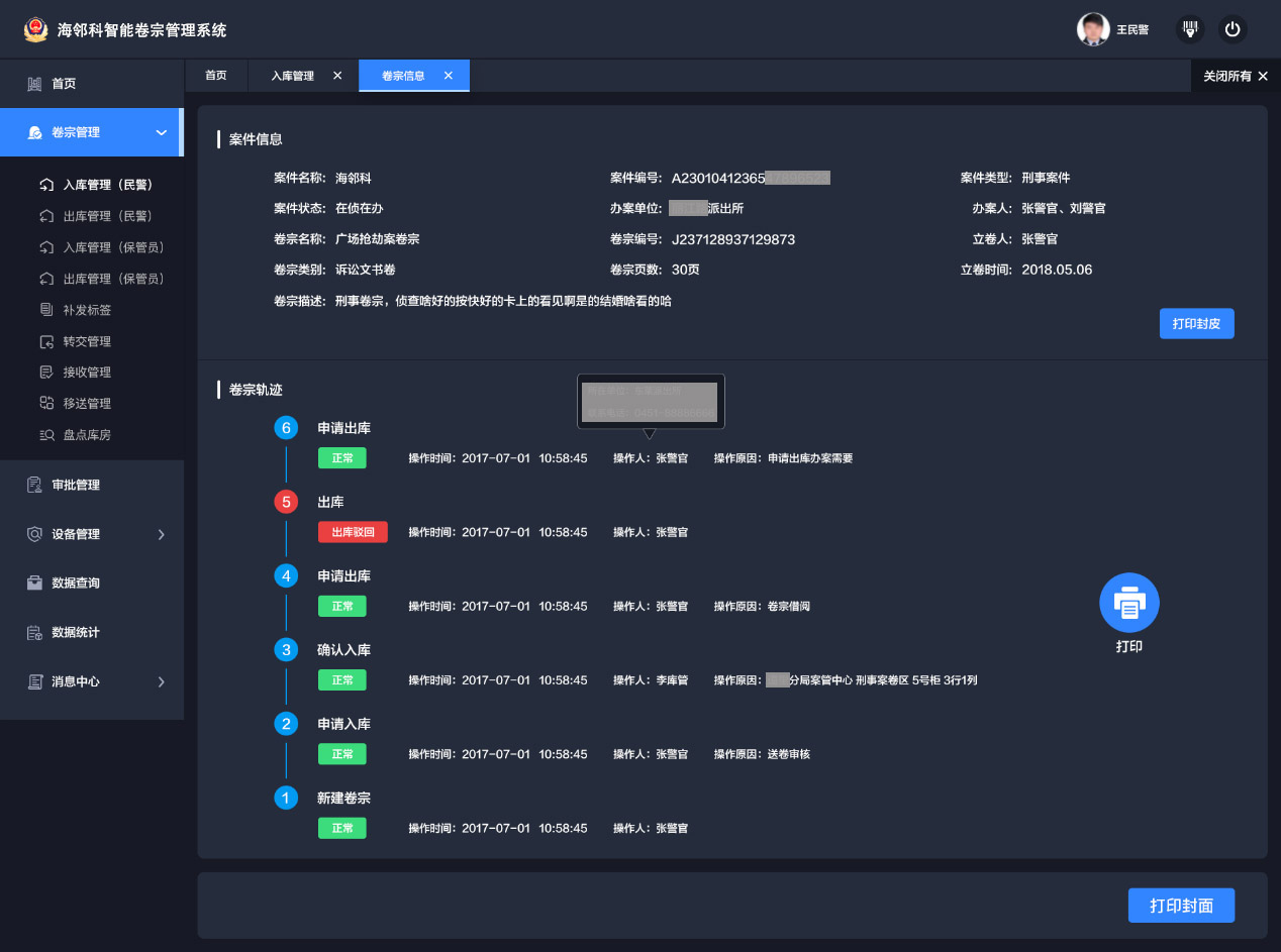 針對已完結(jié)的案件、久偵未決的案件卷宗,系統(tǒng)自動提示民警將卷宗送到統(tǒng)一保管庫房,由庫管員集中保管、科學存儲。