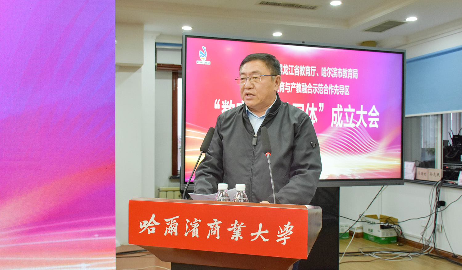 哈爾濱松北區(qū)副區(qū)長王媛、中國(黑龍江)自由貿易試驗區(qū)哈爾濱片區(qū)管委會副主任王凱,哈爾濱商業(yè)大學校長鄭秋鹛、副校長王巍、副校長趙大偉,松北區(qū)工信局、民社局、教育局、發(fā)改局、商務局、文旅局及區(qū)委宣傳部,深哈產業(yè)園,海鄰科公司等相關單位負責同志和工作人員出席大會。