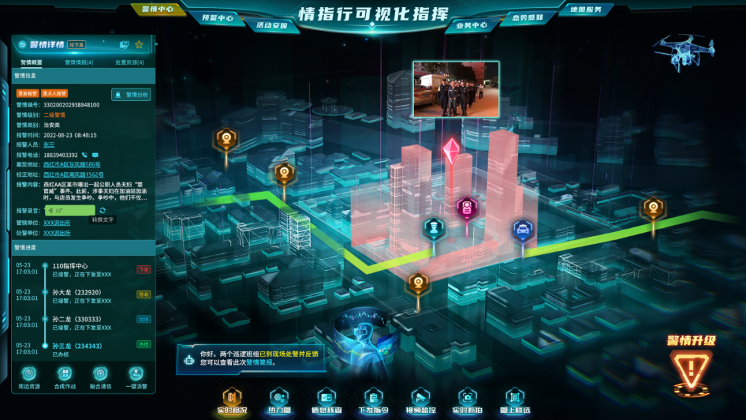 該平臺集成警情定位、警情研判、融合通訊、語義分析等功能,通過情報產(chǎn)品建模分析,服務(wù)各類指揮場景,匹配最優(yōu)處警力量,做到“可視指揮、精準推送、一呼百應(yīng)、全城封控”。